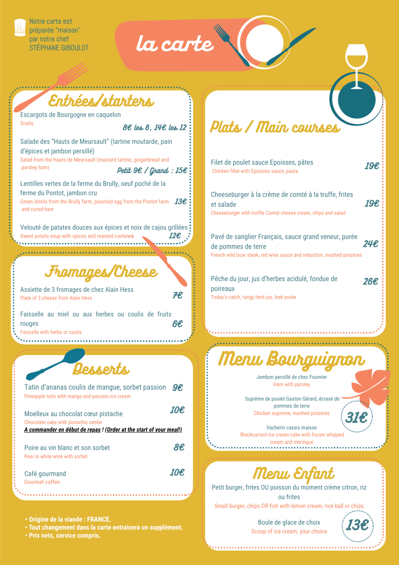 Notre restaurant ouvre ses portes tous les soirs à partir de 18h30, du mercredi soir au lundi soir inclus (fermeture le mardi). Notre CHEF Stéphane GIBOULOT change sa carte complète toutes les 6 à 8 semaines, et son "Menu du Chef" tous les mercredis.